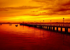 光线一分分暗下去,色彩却愈发浓烈。像是画家在完成作品前,把最后最珍贵的颜料都挤了出来。海天相接处,太阳只剩下半个脸庞,它依依不舍地,把最后的光芒编织成一条金光大道,从遥远的天边一直铺到岸边,仿佛在邀请勇敢的人踏上去,走向世界的尽头。