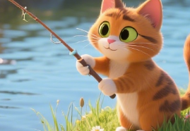 阳光洒在小河边的草地上,小猫花花蹲在河边,看着水里游来游去的小鱼,馋得直流口水。它学着妈妈的样子,拿起鱼竿甩进水里,可等了半天,一条鱼也没钓到。